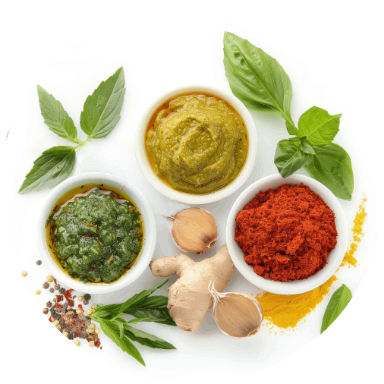 Besides our regular range, we offer a unique selection of specialities, including garlic and ginger purees, Tabasco, tomato puree, olive oil, and other high-quality seasonings. These products are developed for easy application and processing in sauces, among others.